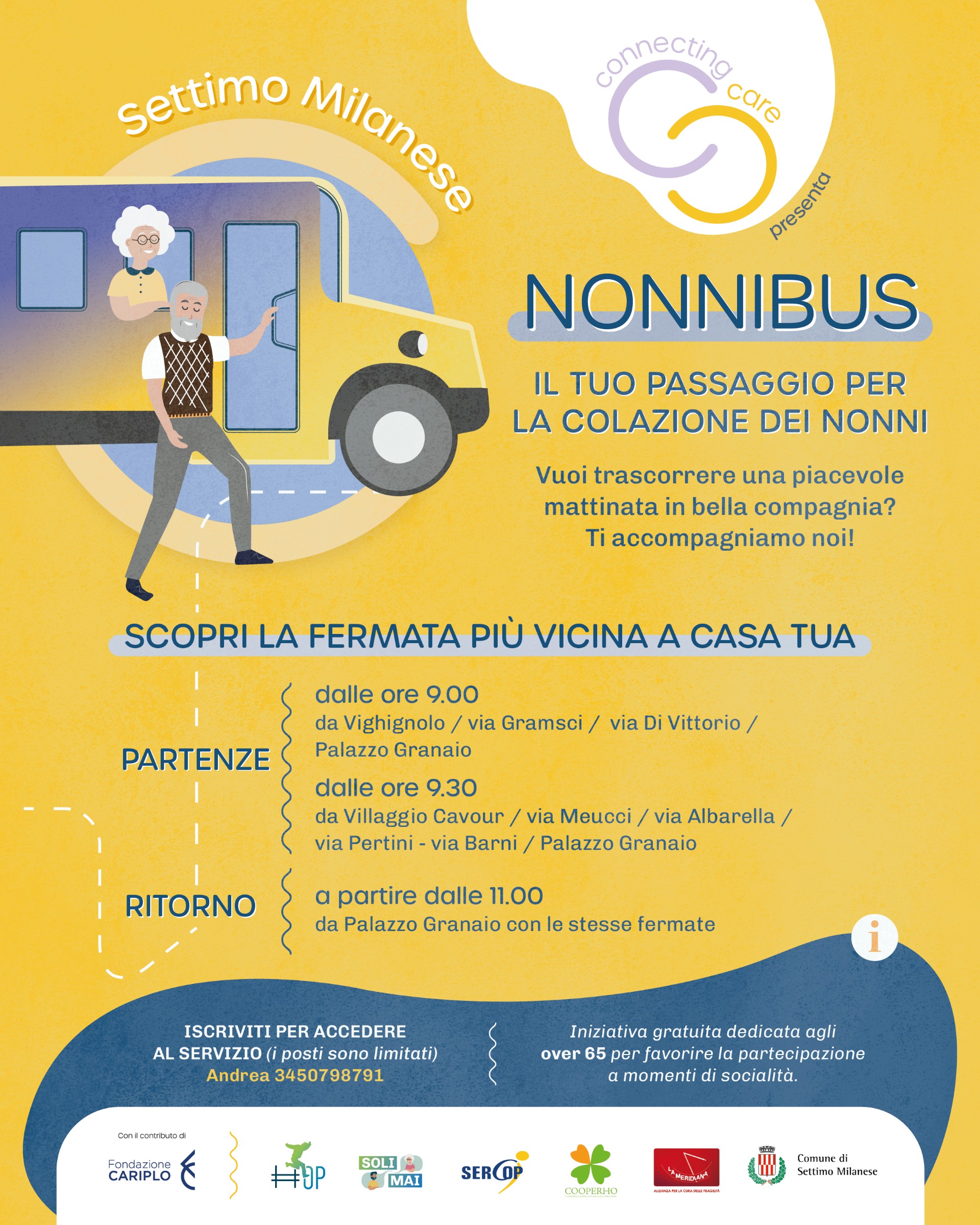 | Da lunedì 3 Novembre inizierà il servizio di trasporto “Nonnibus” per portare tutti i lunedì mattina le persone over 65 anni di Villaggio Cavour, Seguro, Settimo e Vighignolo alla colazione dei nonni.