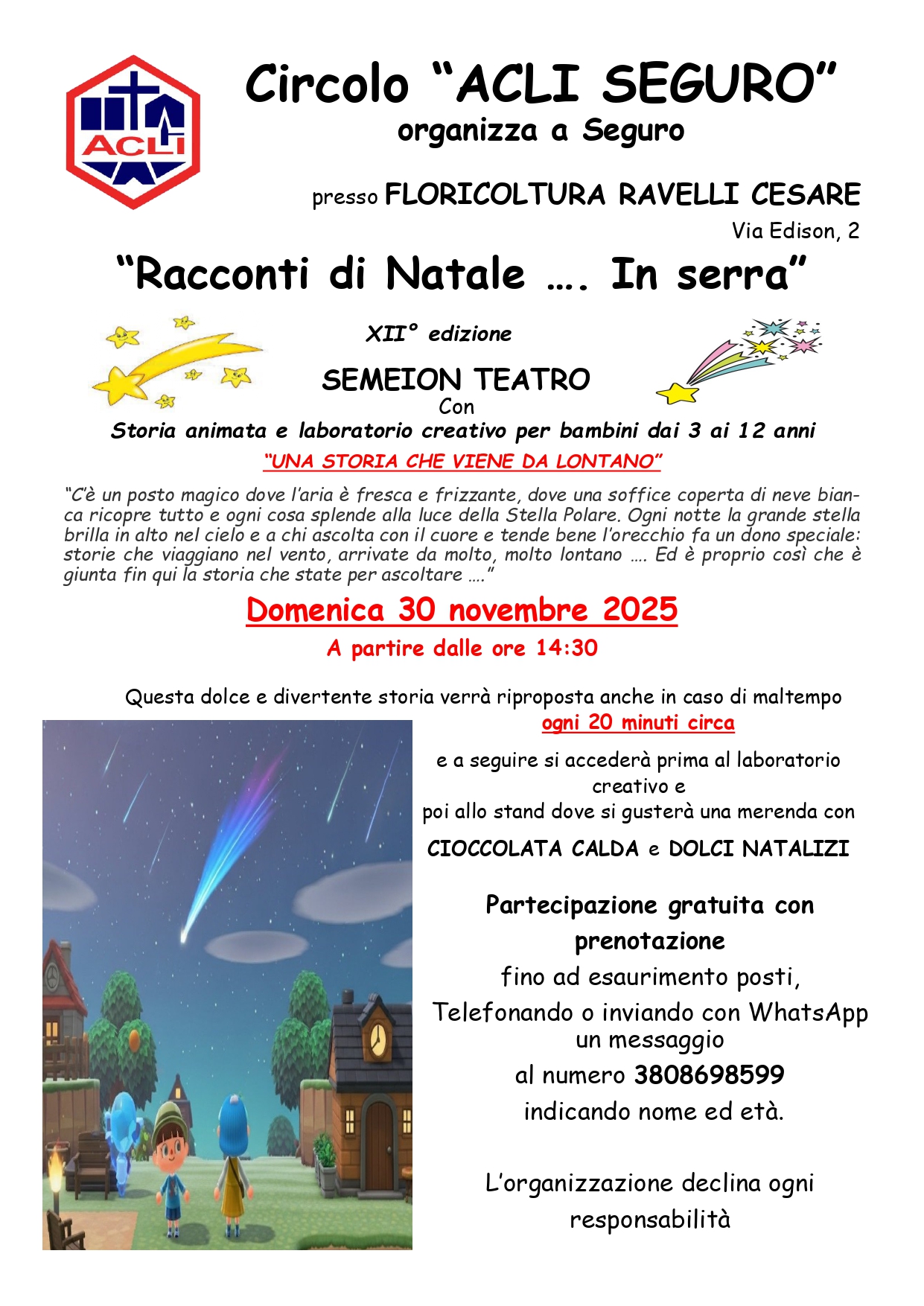 Partecipazione gratuita con prenotazione fino ad esaurimento posti, telefonando o inviando con WhatsApp un messaggio al numero 3808698599 indicando nome ed età.