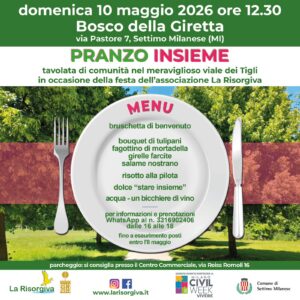 Una domenica all’insegna della convivialità, della natura e del senso di comunità: è questo lo spirito del “Pranzo Insieme” organizzato per il 10 maggio 2026 nel suggestivo Bosco della Giretta, nel cuore di Settimo Milanese.